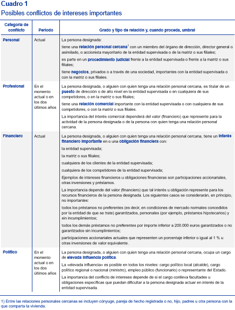 Y, sobre los conflictos de interés el BCE se muestra tajante al señalar que los miembros de los órganos de administración deben poder adoptar decisiones fundadas, objetivas e independientes, que pueden verse afectadas por la existencia y materialización de conflictos de interés. La Guía adjunta el siguiente cuadro, detallando los posibles conflictos de interés: